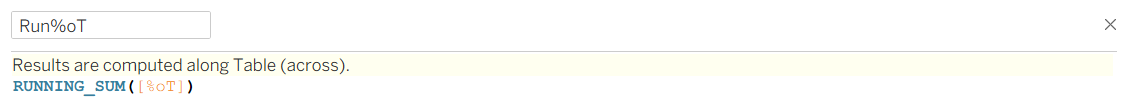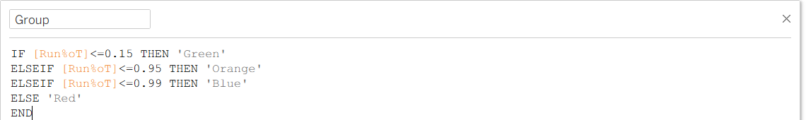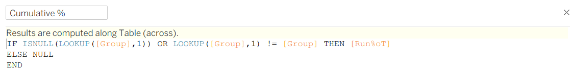 This calculation returns the current Running %oT value only if the row is a boundary. For all other rows (those somewhere in the 'middle' of a group), it returns NULL. This will then later allow us to filter for non-null values to product a clean summary table.