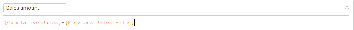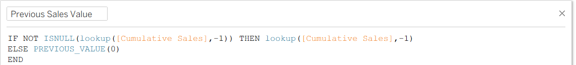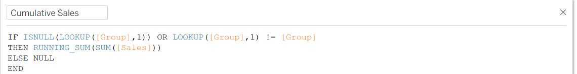 As the total for the 'Green' group exists hundreds of rows above the one for the 'Orange' group, we need a way to resolve the gap between the boundary. This calculation allows us to do so. It checks the previous row, and if that row is a boundary (and therefore has a valid Cumulative Sales value), it captures it. If the previous row is NULL (a hidden middle row), the calculation ignores it and retains the last valid value it found. This carries the previous group's total down the list until it reaches the current boundary.