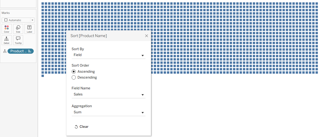 First, drag Product Name to the Detail shelf. Right click it and choose Sort.
