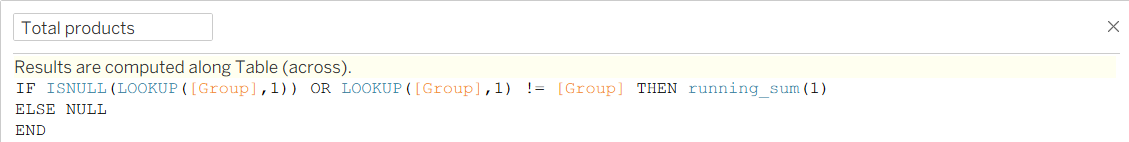 Standard aggregations like COUNT() would not work here as Product Name is in the view, Tableau sees every row as a distinct item and would simply return a count of "1" for every row. To get the volume of the group, we need a cumulative counter. RUNNING_SUM(1) effectively numbers the rows based on the sort order. This tells us that the Green boundary is, for example, the 1,327th item in the list, providing the number we need for the subtraction logic later.