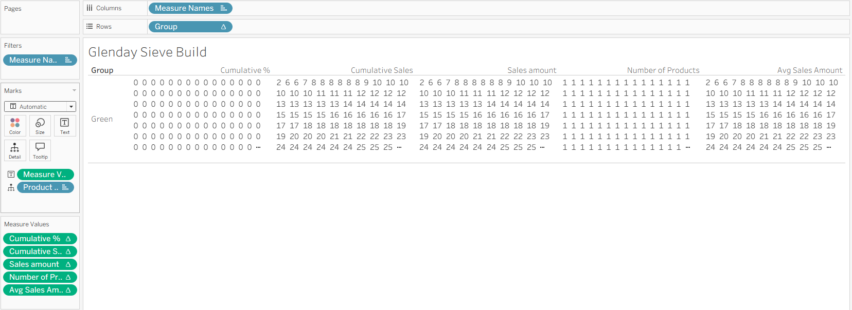 To create a summary table while keeping Product Name in the view, we must filter out the majority of rows. We cannot simply aggregate the data, as this removes the sort order required for the Glenday Sieve logic.