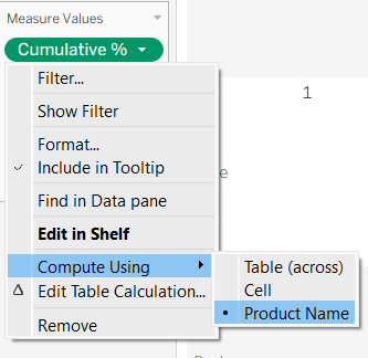 Grouppill on the Rows shelf. - Select Compute Using > Product Name.