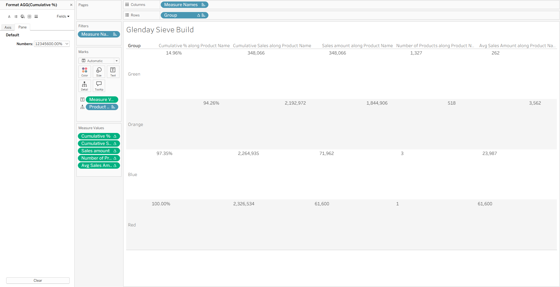 3. Fix the Number Formatting: At this stage, your Cumulative % column might only be showing values of 0 or 1. Tableau is rounding the decimals (e.g. 0.14) to the nearest whole number, and we need it to show more detail than this.