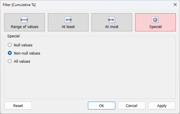The final step is to drag Cumulative % onto the Filters pane > Special > Non-null values and Apply. Make sure that filter is also being computed using Product Name as we did for all of the other pills. Now, this should leave a single number in each column and row of the table, without any odd positioning of the numbers, as you have filtered out all of the NULL values (everything that is not a boundary row).