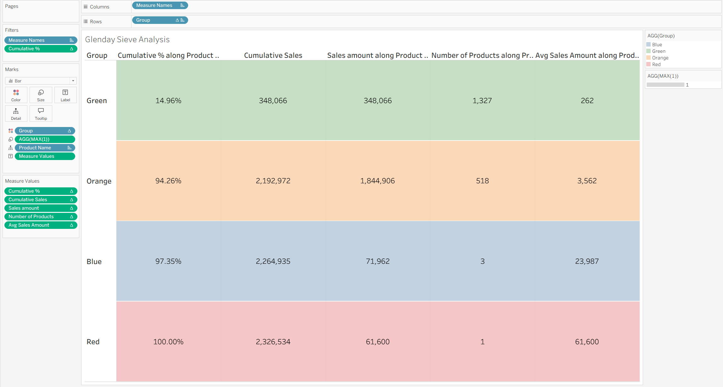 The requirement of this analysis is to view a summary table: 4 rows (Green, Yellow, Blue, Red) showing the total sales, cumulative % those products are contributing to Sales, and product count for each.