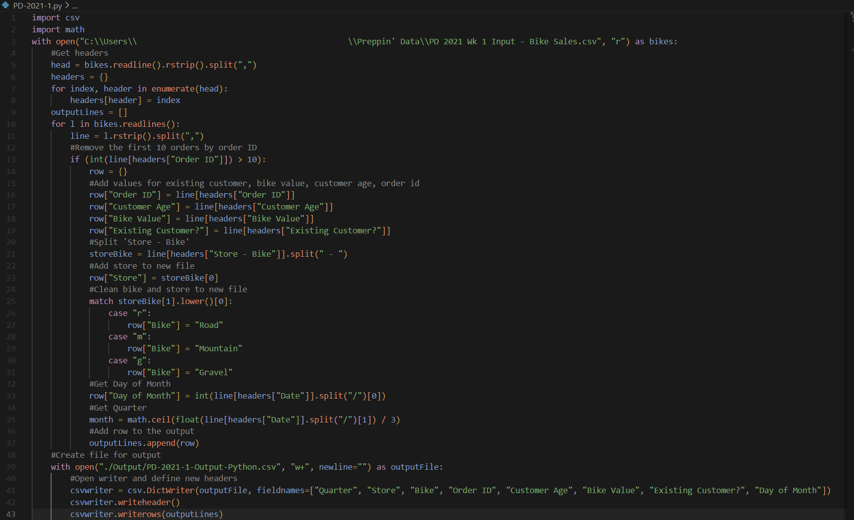 In regards to this task, I had to import in the input file, read the headers and keep track of their positions. Each record in the file is read as a single string which I then split up using ',' as a delimiter. Using the 'with-open-as' format covers the closing of the connection to the file, rather than needing to add it into the end. This also prevents the output file from being created if the input file doesn't.