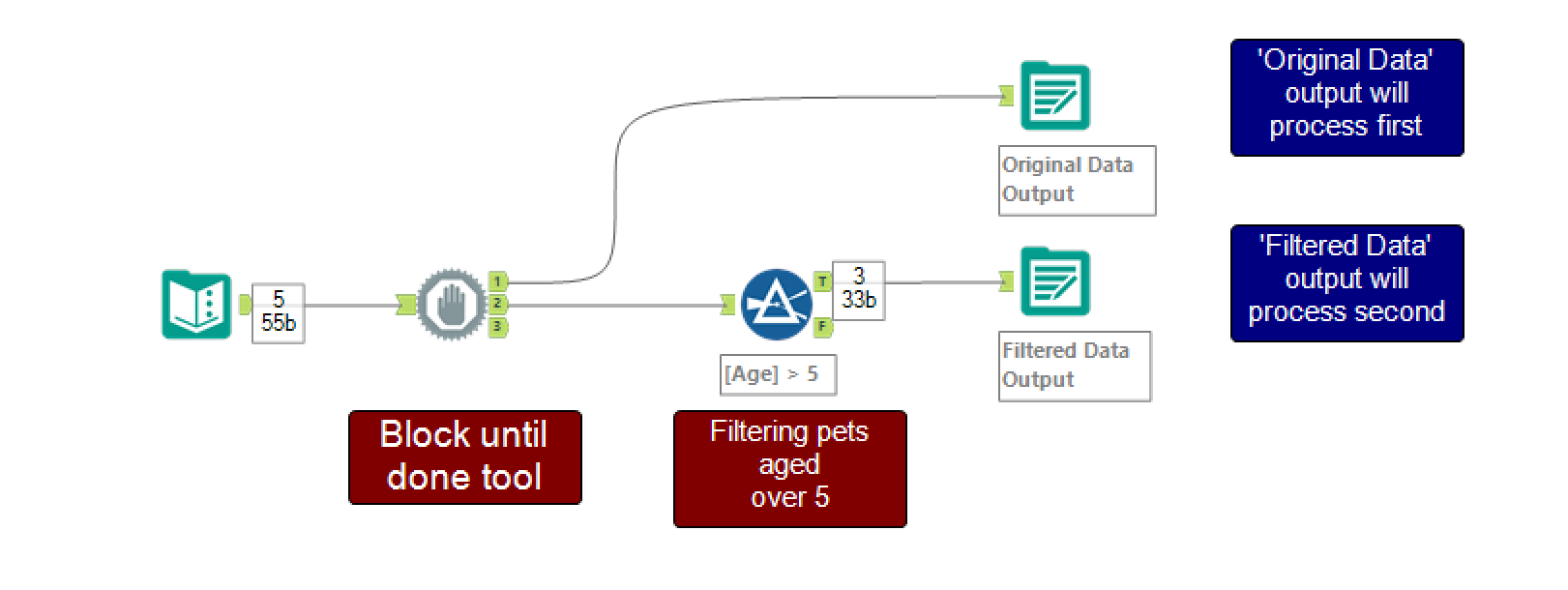 The Block Until Done tool will process the flow out of anchor 1 before processing the flow from anchor 2 (and then 3). So hopefully when we hit run the original data should be processed and saved a sheet first in excel, with filtered data saving as the second excel sheet.