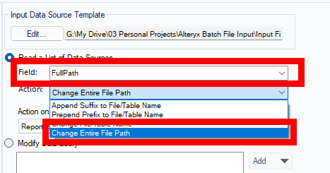 FullPath.- This way, you are telling Alteryx: “For each row in the Directory output, replace the full path in my example file with the one from this row.”