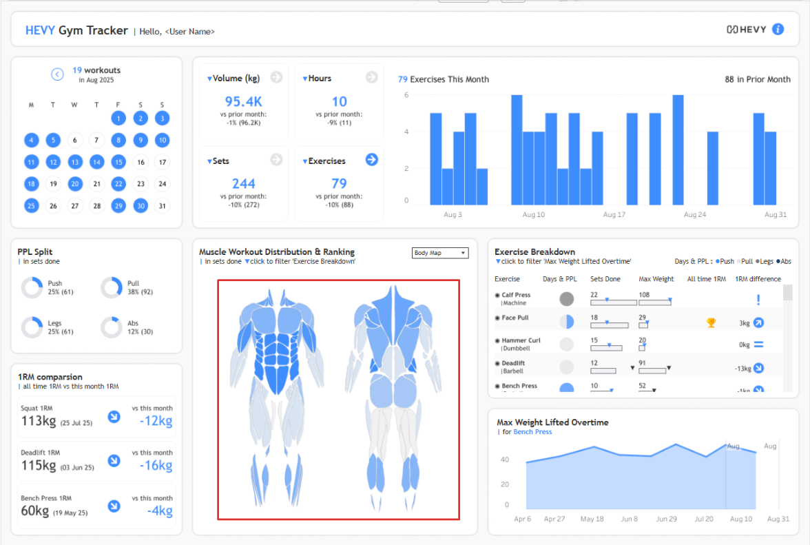 I recently built a Gym Tracker dashboard in Tableau using data from my gym app, Hevy, and created a body map to visualise muscle engagement.