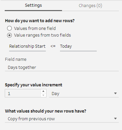For the example specified (preppin data challenge week 7 2024), we will use the option to generate rows between two dates. The challenge requires us to calculate the number of Valentines Days each couple has spent together. We will generate rows between the date the relationship started and today.