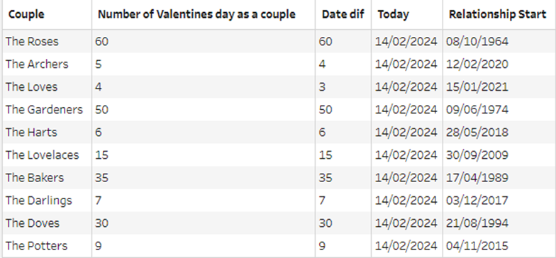 If we used the date diff calculation at a yearly level instead of the new rows function, the output number would not take into consideration the couples whose started their relationship before Valentines Day so have celebrated one more valentines day than the number of years they have been together.