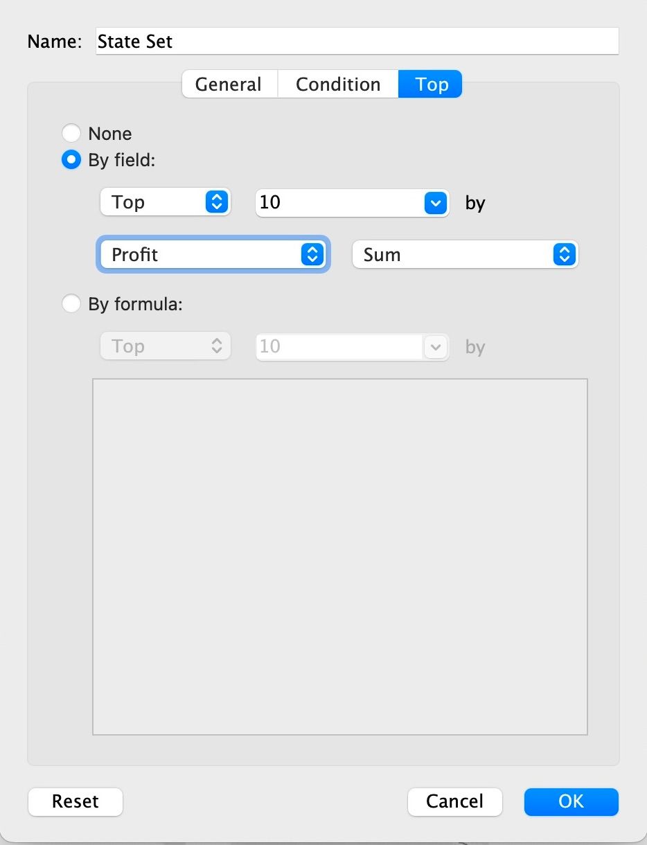 A Top Set is used when only the Top N is included based on a measurement (e.g., Top 10 States with Highest Profit).