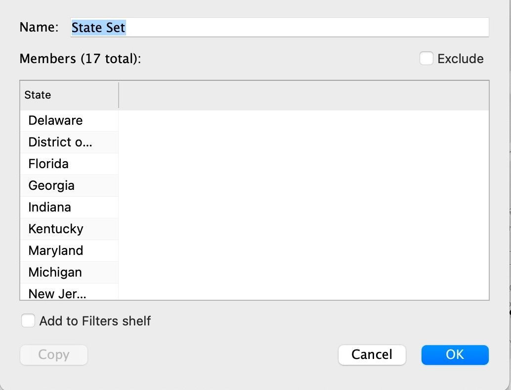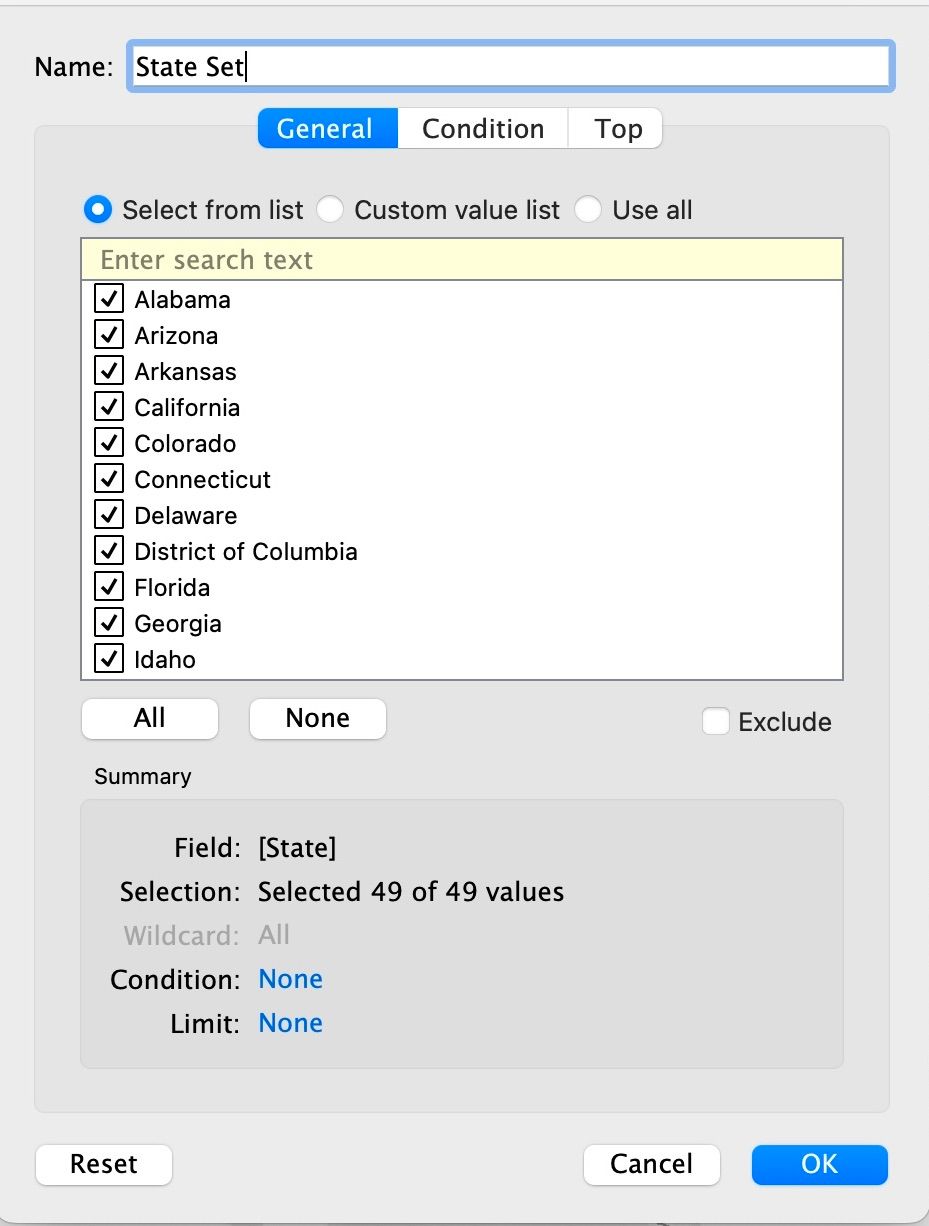 A Set is a custom field based on rule or condition. Sets operate under a binary (i.e., IN/OUT, true/false). When a set is dragged into the view, "IN/OUT" is displayed on the pill.