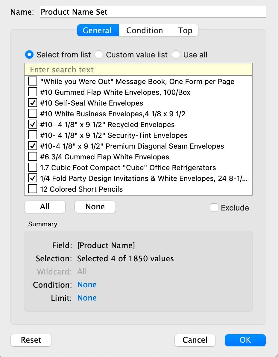 When creating a General Set, select 1 or more values to include in the set, or the select the "All" option so all values are considered.