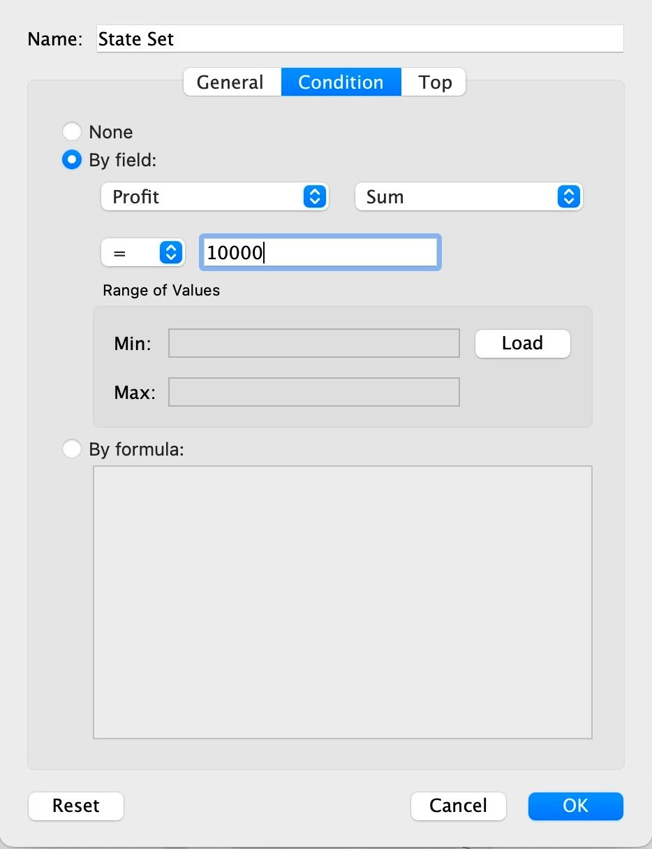 A Conditional Set is used only specific values are included based on a rule or condition (e.g., State with profit > $10,000).