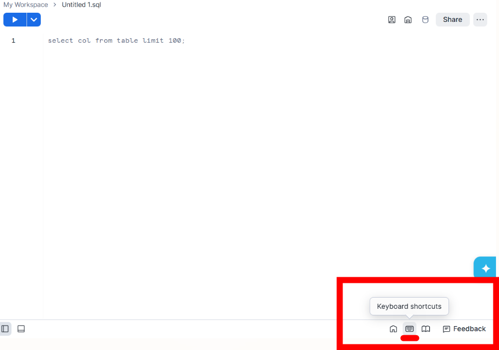 Snowflake has a menu of keyboard shortcuts that can be found on the bottom right of the window.