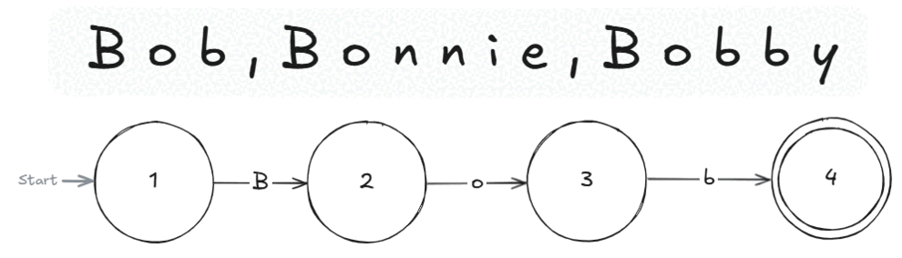 The RegEx "Bob" can be equivalently represented by this state machine: