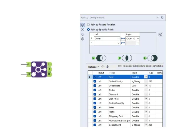 As seen in the image above, the join tool has 3 output anchors, representing the joined rows (J) as well as the unmatched records in the left table (L) and the right table (R). Incase you ever forget, Alteryx provides a neat illustration representing what each anchor represents in the configuration window. It might be frustrating initially to discover that the (J) anchor can only contain an inner join of the two inputs as opposed to a different join method of the user's choice, however there are a few ways to perform different join types, such as left/right joins, and full joins in Alteryx. In this blog, we will go over 2 key ways to perform different join types in Alteryx.