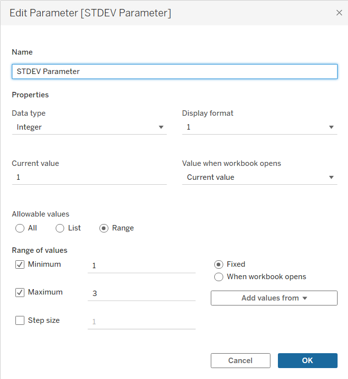 For this parameter, I set it as a range with the minimum being 1 and the maximum being 3. You can adjust the minimum and maximum based on your project needs. Click okay and now we'll begin creating the calculation.