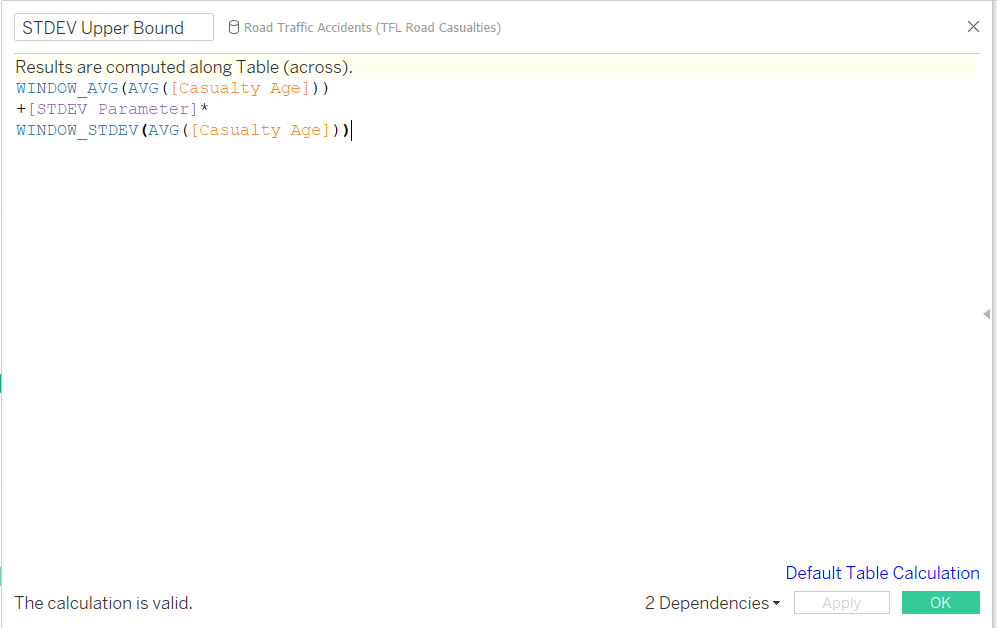 For this step, you will need to create two standard deviation calculations, one for the lower bound and another for the upper bound. This calculation utilized the Window_Avg and Window_Stdev functions.
