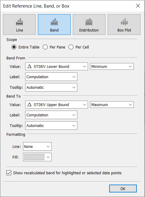 Now that the parameter and calculations have been created we can step into the analytics pane to create our dynamic standard deviation band. In the analytics pane select 'Reference Band' under Custom. All that is left to do is set our band values.