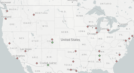 You’ll receive two outputs from that – matched and unmatched data. The matched data will include all the cities that are within the set radius around the hospitals and the unmatched cities are further than the maximum distance away from a hospital. Additionally, the browse tool will show you your target (red) and universe (green) locations on a map.