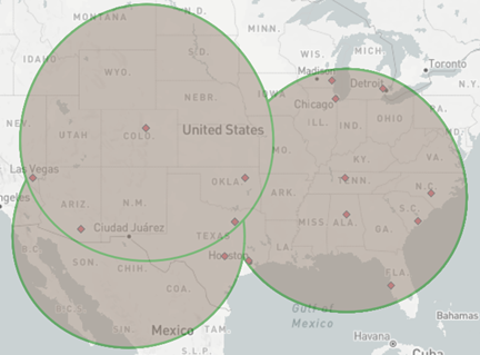 To achieve this you can work with trade areas. Using the “trade area” tool in Alteryx you can create a radius, a doughnut or even a drivetime radius around the universe centroid. You then combine those with the target centroids via the “Spatial Match” tool where you can configure exactly what cases you want to display. Here we want to look at the locations “Where Target Within Universe”. You will once again receive matched and unmatched data and can view the locations on a map, only this time you will be able to see the trade areas of the universe locations and this way can spot possible overlaps.