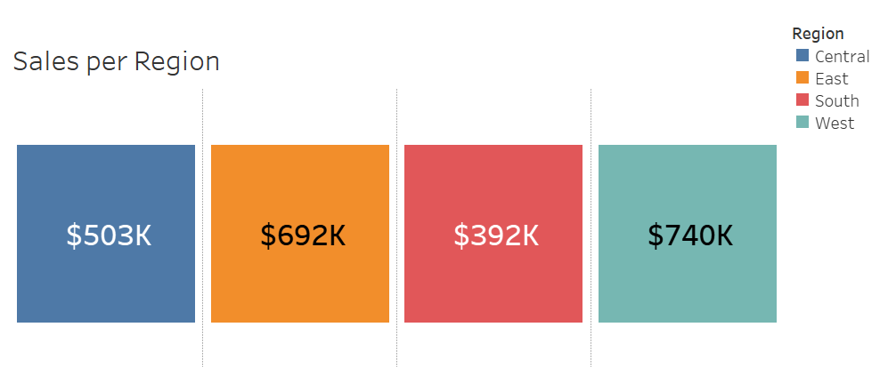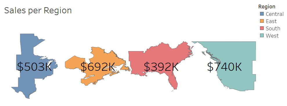 So How to do this: First place region on to columns. Next change the view to entire view. Now change the mark to map. Now we can adjust the size of the map and also add region on to colour. Finally we can add our contextual number, for this example I am just going to do sum of sales. Now its just formatting I just increased the size of the text and made it centrally aligned.