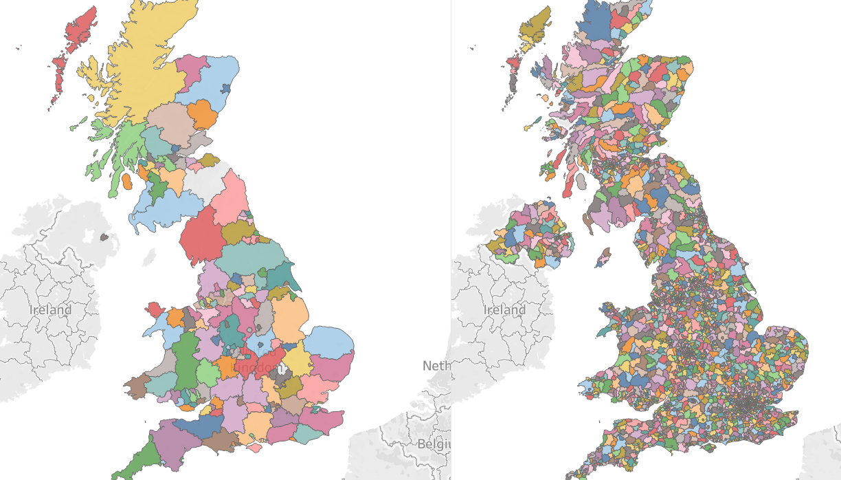 Above shows a map of all UK Counties (Left) and Postcodes (Right).
