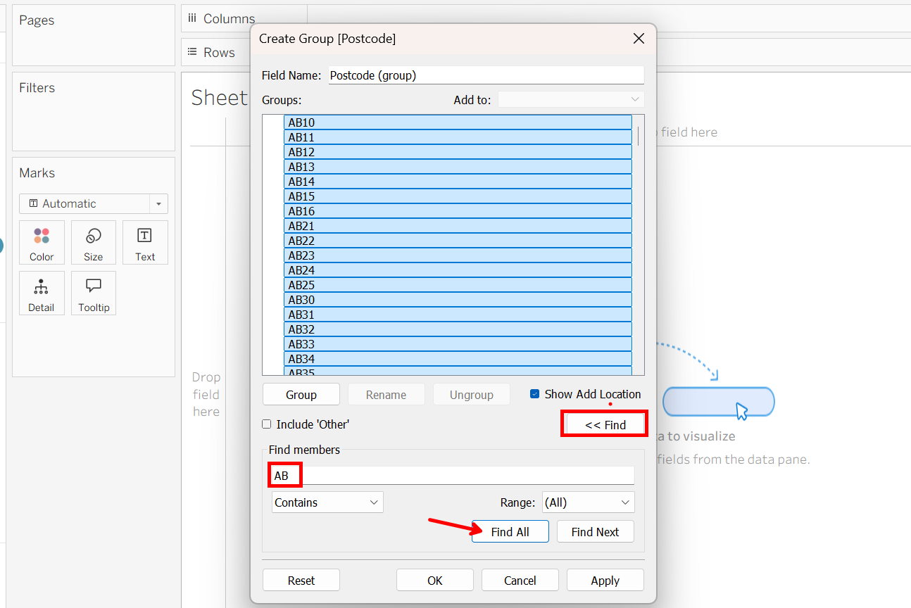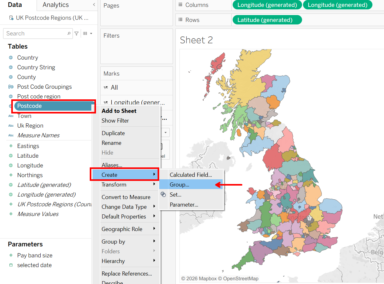 In order to visualise UK regions within Tableau, you have to first find a dataset containing all UK Postcodes (one can be found within the linked Tableau Workbook below). After sourcing your data you need to create a group within your postcode field.
