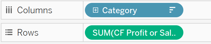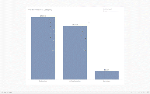 Below is an example of a parameter in action. The user is able to switch between viewing 'profit by product category' and 'sales by product category' on the same worksheet.