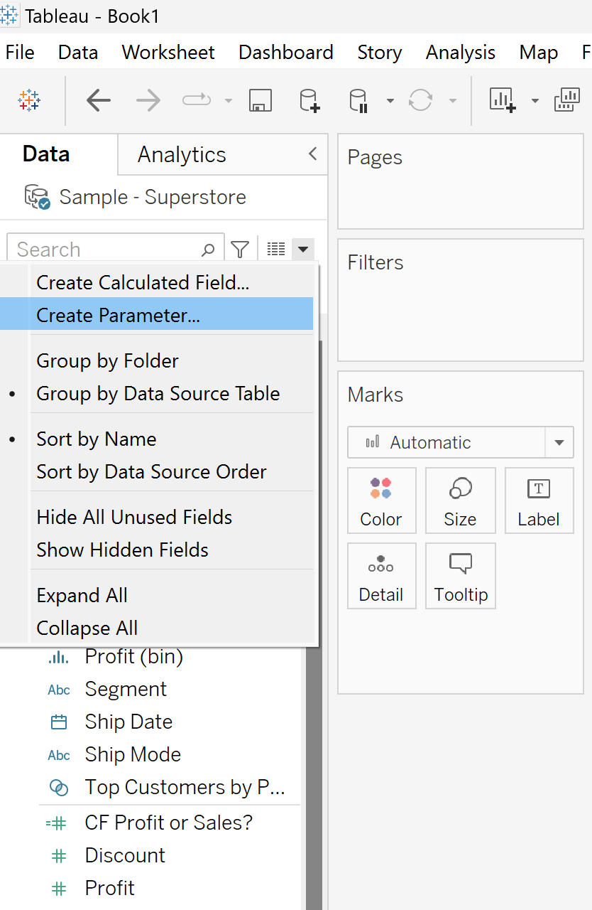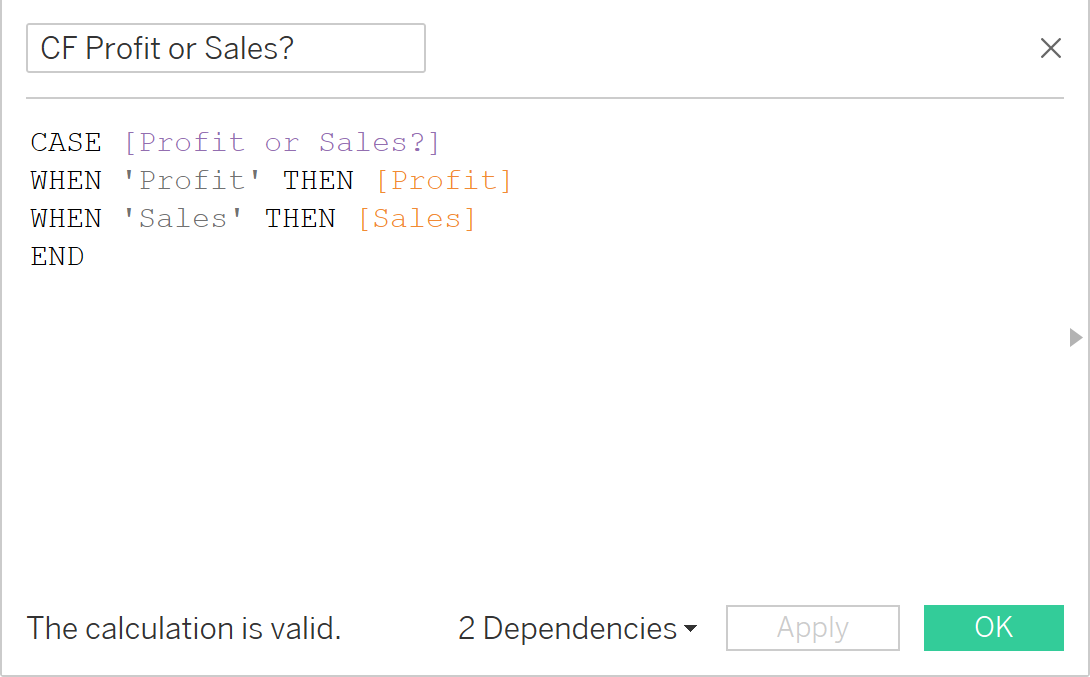 2) Create the following calculated field: a parameter without a corresponding calculated field is useless. In order to allow the user to control the sheet, we need to create a calculated field referring to the parameter we made earlier.