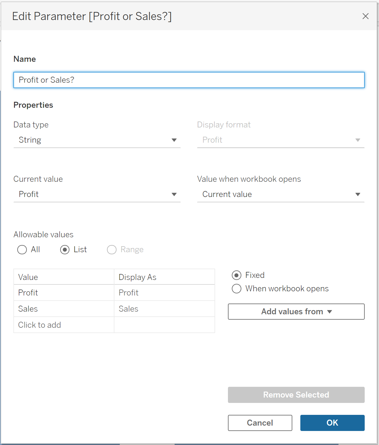 We then give the parameter a suitable name, select 'String' as our data type, and 'allowable values' to 'list'. Then type in the name of the fields you want to user to toggle in the table below, in this case, 'Profit' and 'Sales'. Then click 'OK'.