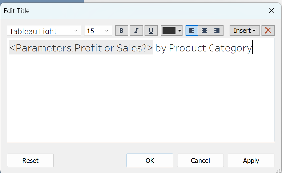 4) The final step is to edit our title so that the title of the sheet adjusts as the user changes the parameter value (you may need to edit the parameter values or title wording so that it makes sense).