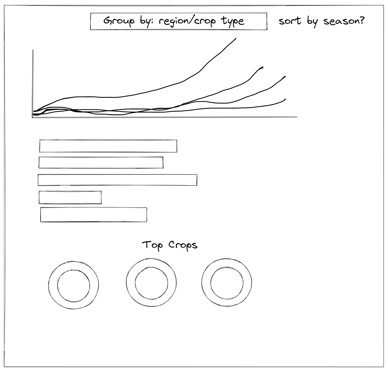 As you can see in the sketch above, I also decided to place filters at the top of the viz. This added an extra layer of interact-ability, and changed the data that was modelled by the charts, aside from the charts that already showed all continents. This was particularly powerful as it allowed me to change quickly between values of planted area, total value and production for each crop type.