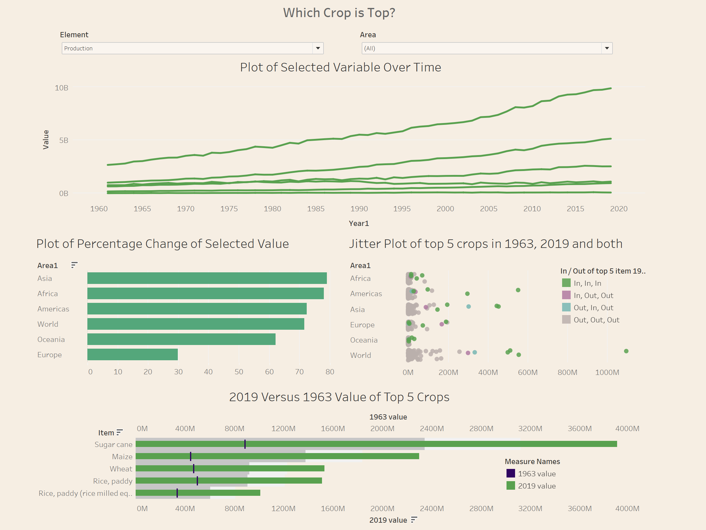 When playing around with the dataset I realized a large section that had been missed by the original viz was that there was time data ranging from 1963 to 2019. This inspired the idea to put a line chart at the top of my re-worked viz, as it draws the user in and describes the time-oriented data really well. Following this I decided to follow up with a version of the bar chart from the original makeover monday viz. However, my one would be shorter and instead be categorized by continent. This attacked the data from a different, and I thought more interesting, direction. I also plotted a jitter plot with the most valuable 5 crops in 1963 and 2019 overlaid. This created an interesting looking chart, with the overlapping crops in both top 5's highlighted in a different color to further show the most popular crops over time.