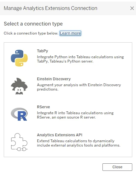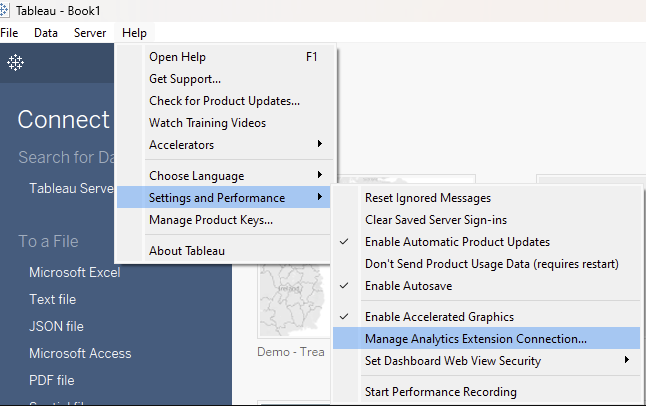 - Next we can start to configure the TabPy connection in Tableau by first navigating to the the “Manage Analytics Extension Connection…” selection via Help → Settings and Performance → Manage Analytics Extension Connection…