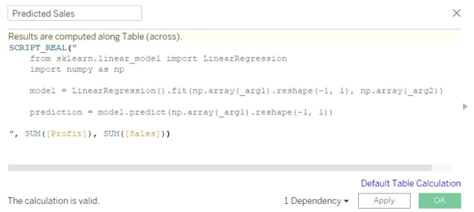 This script fits the linear regression model using the Profit field (_arg1) as the independent variable and Sales field (_arg2) as the dependent variable. It predicts the Sales based on the trained model with model.predict and returns the results.
