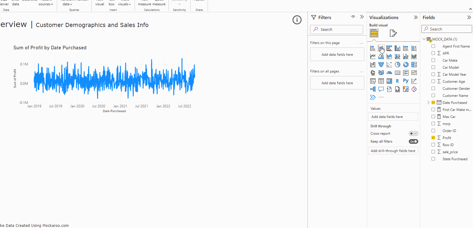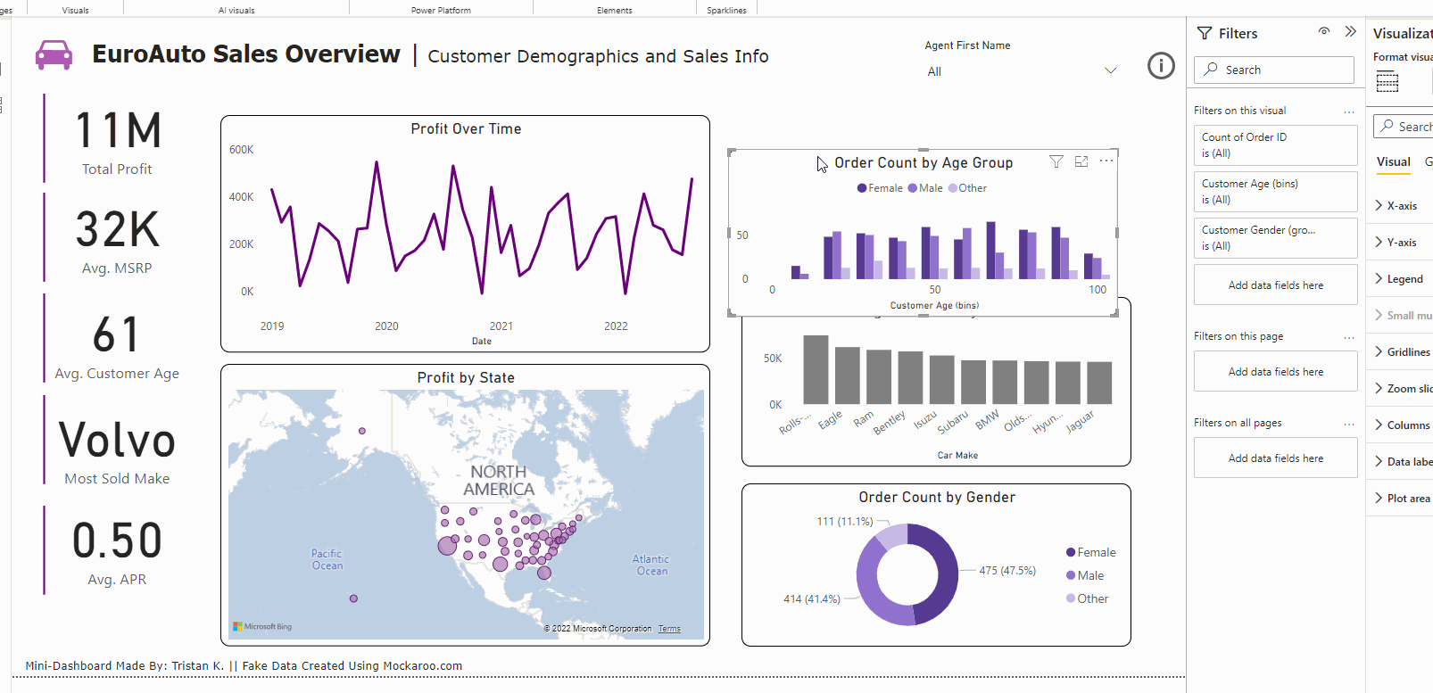 The goal today was to create a fake dataset using mockaroo.com for a chosen industry and make a dashboard in Power BI. This was a relatively easy task but with such limited time using a new product, it proved to be a decent challenge. This blog will briefly touch on some of the differences I noted between Tableau and Power BI but before I get into that let's take a look at the fake data I made and my final product: