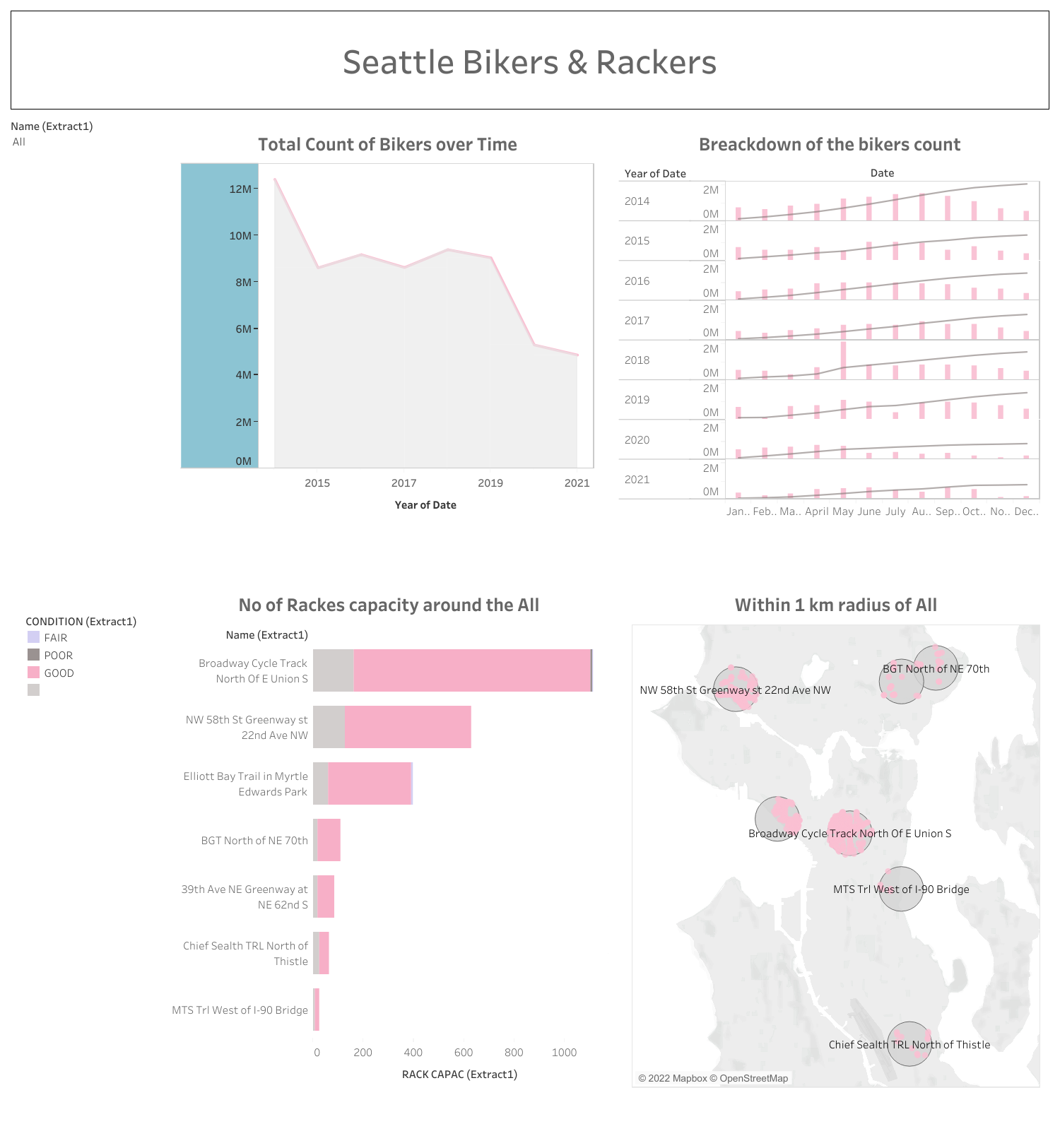 Today's data was about bike/pedestrian counter in the city of Seattle. i decided to add more content i decide to add cycle racks dataset to it.