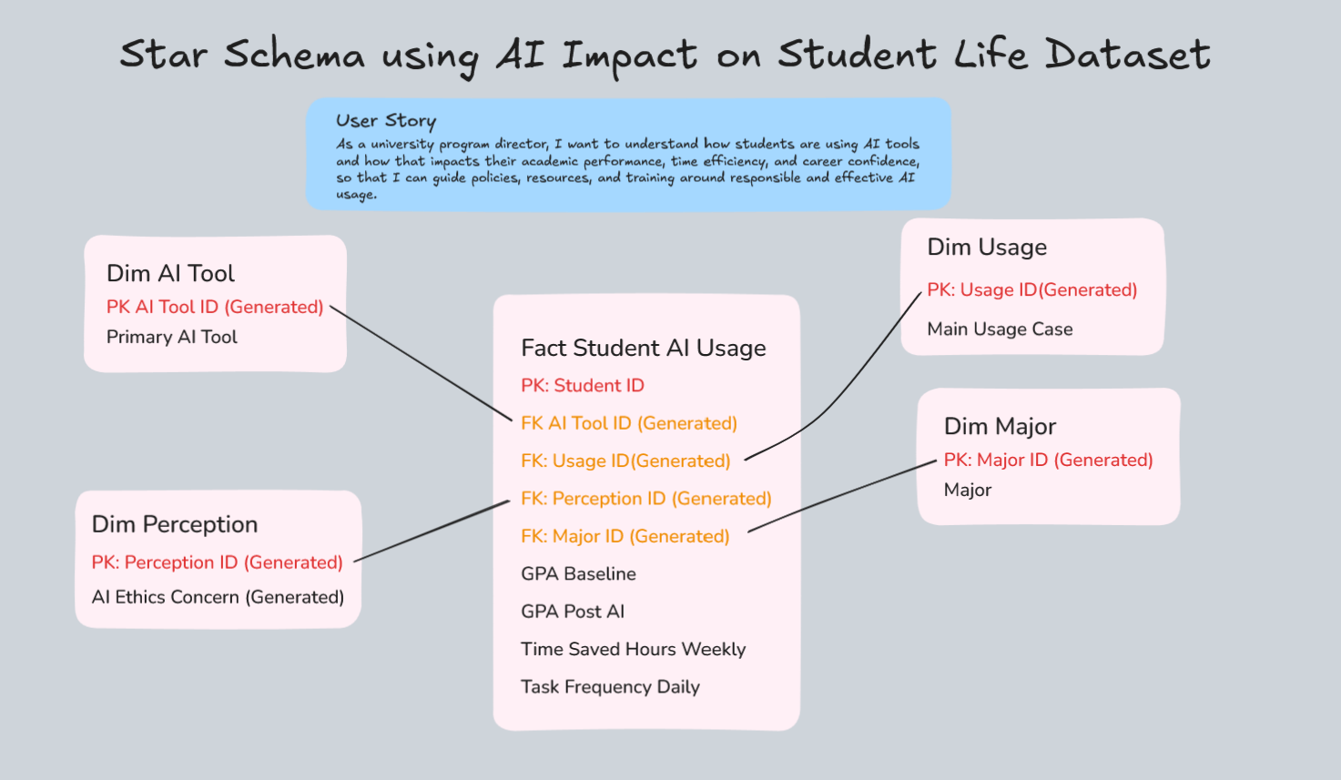In this blog, I’ll walk through how I took a raw dataset on AI’s impact on student life, broke it into a star schema, and connected it to a user story.