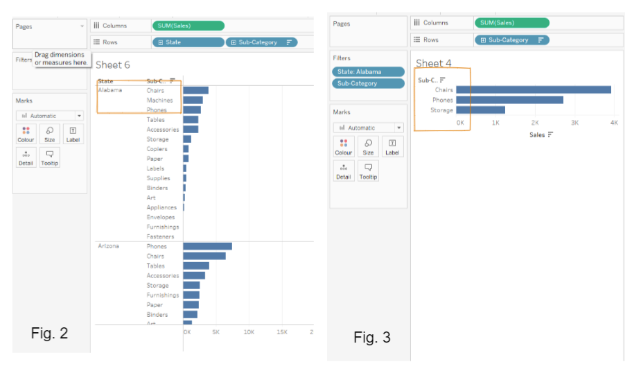In fig. 2 bellow we have the sales per State and per Sub-Category. We can see that the top 3 Sub-Categories for the State of Alabama are Chairs, Machines and Phones. If we do the same calculation using the Top N filter for the Sub-Category (N =3) we get a different result for Alabama: Phone, Chairs and Storage. We get two different results. The reason behind this different results is the Order of Operation Tableau manupulated data. Also, in effect we answer different questions. In figure 2 the question asked is: What are the top 3 sub-categories per state? In figure 3 the question asked is from the top 3 sub-categories, what sales were made in Alabama. In other words, in the first example we use dimension filters. In the secont example we use context filters. As we have already seen, context filters are performed before the dimension filter. This is why we end up with different results.