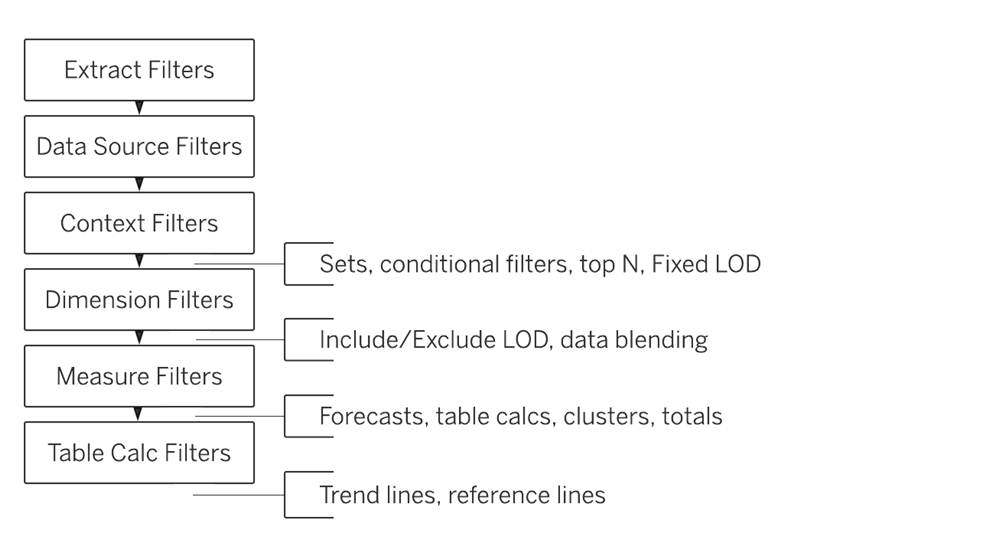 The order in which Tableau executes varios actions is called Order of Operations. In this context operations are all filtering actions, sets, parameter actions, LOD actions, table calculations, total, MIN and MAX functions, trend lines, reference lines etc. Tableu offers the following diagram: