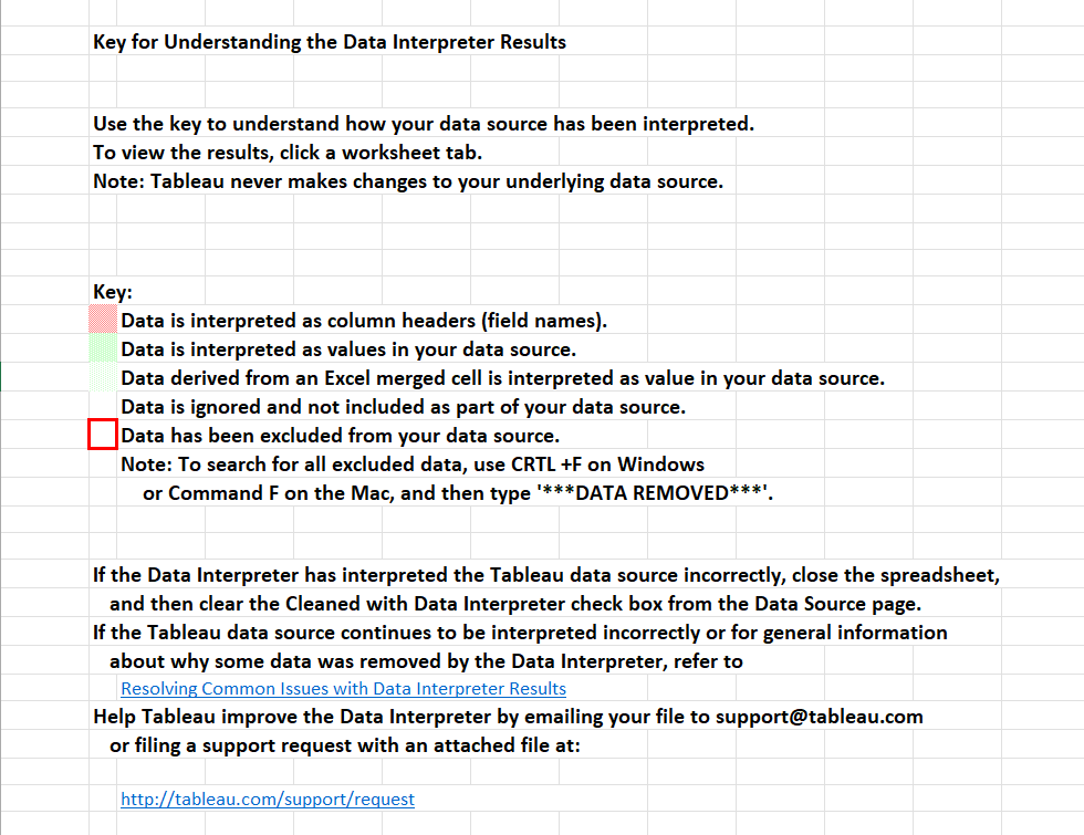 The data interpreter is a tool available in tableau desktop and Prep that cleans your data by removing the things listed above. This allows tableau to properly interpret your data, ready for you to create visualisations from it. It can even detect sub tables and additional tables in your data so you can work with each subset of data independently from the others.
