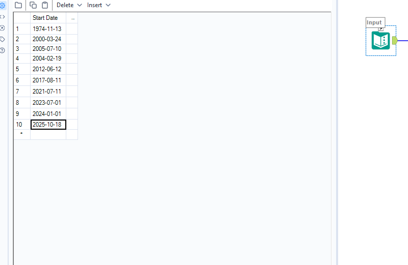 - Drag a Text Input tool to the canvas. Create a column called Start Date and populate it with some sample dates.