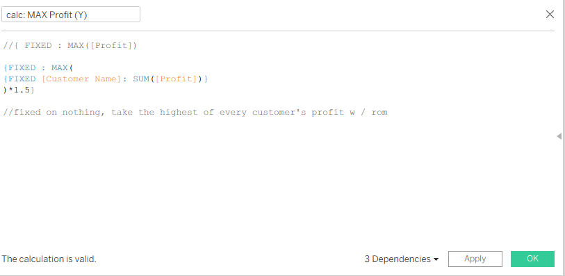 The nested LoD calculates the highest profit per customer across the entire dataset (multiplied by a small constant). Similar calculations for the minimum and maximum of both axes ensure that, when you hit the reset button, the scatter plot fully reverts to show all marks in the view.
