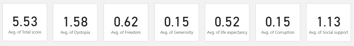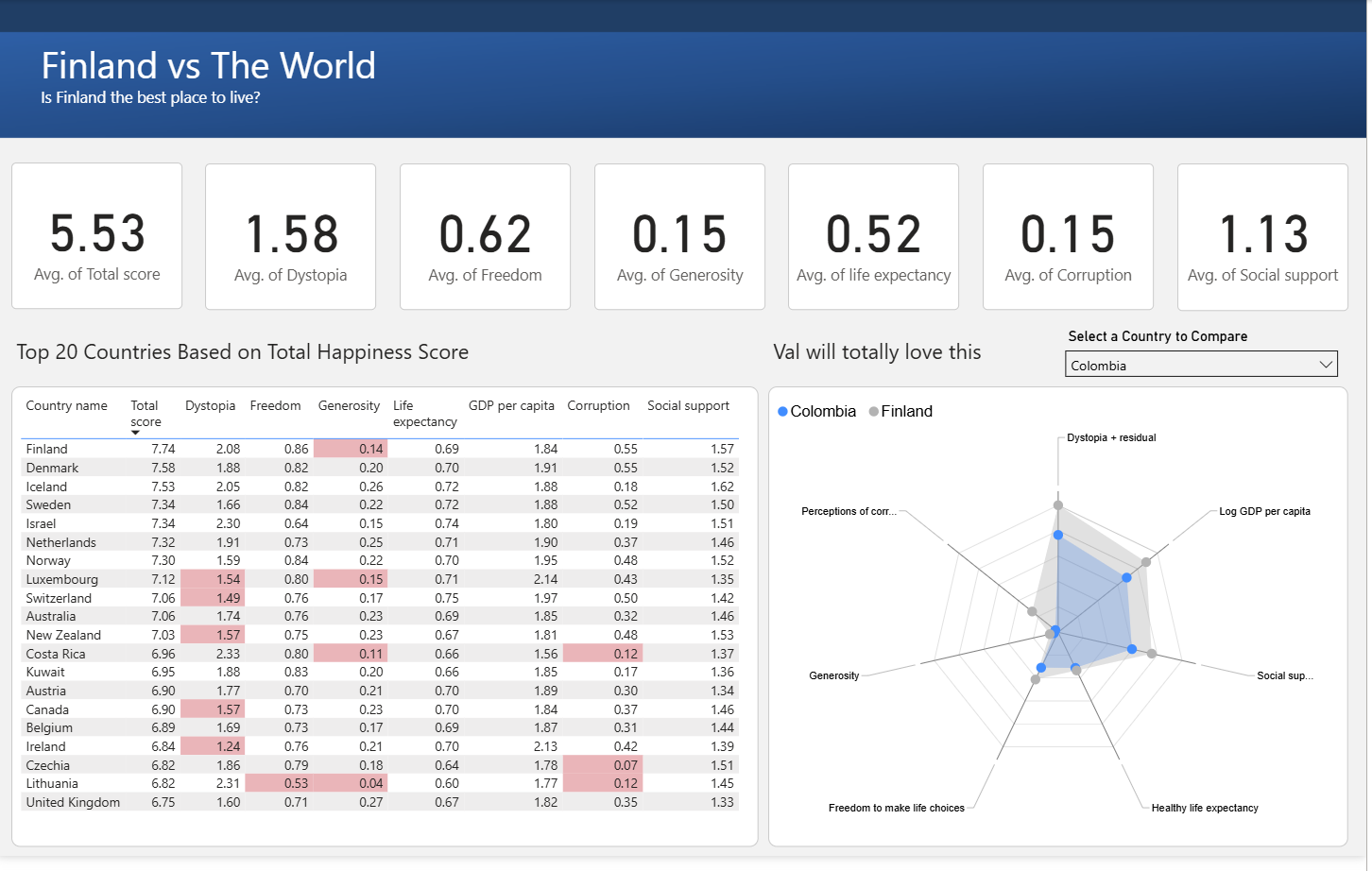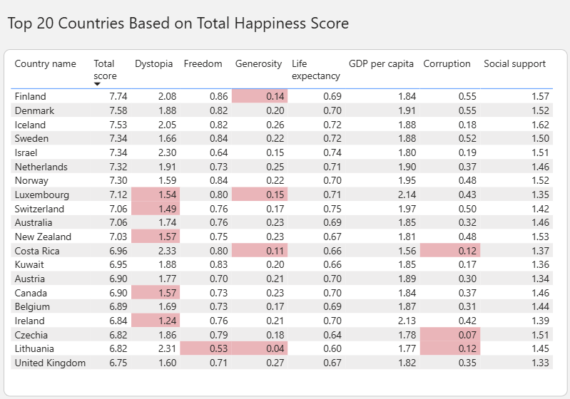 Lastly I wanted to create a table of the top 20 countries based on their total score. Again the Table visualization made this pretty simply by just dragging on the columns I wanted, along with some conditional formatting we were able to highlight the sections of the top 20 Countries that fall below the average in red.
