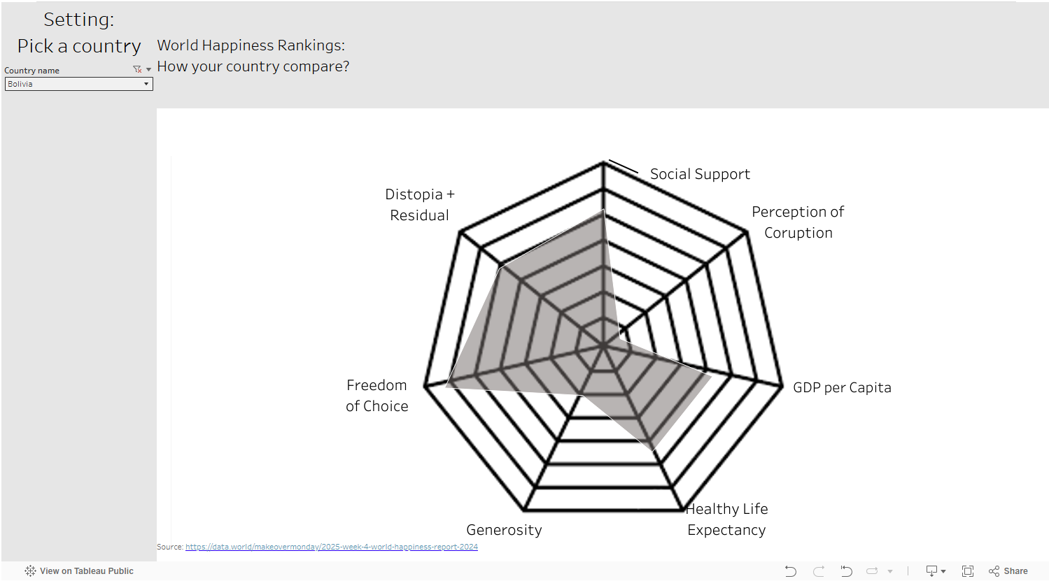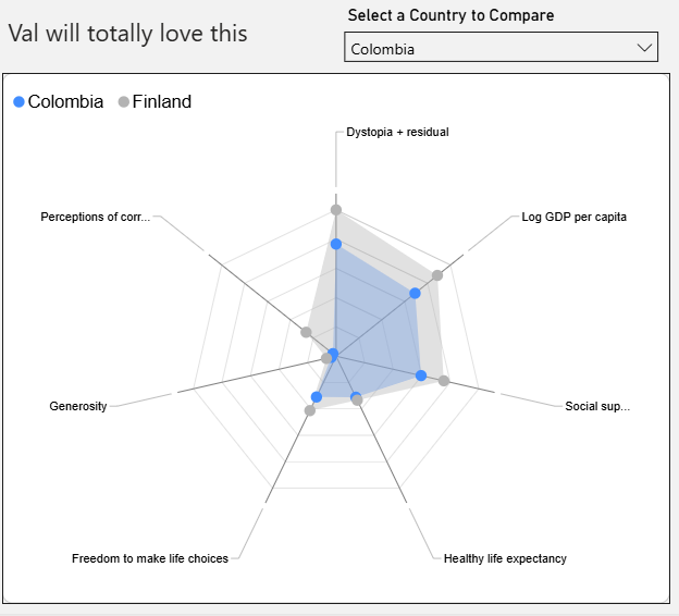 And once you drag in the attributes column it will make the spokes those defined categories we have above. The parameter was a little more tricky. We had to them create all new measures for each country and turn them into AVG of the original column. This then allowed us to fill them into the parameter and in return gave us that drop down menu where we can filter to specific countries compared to the top one(Finland).