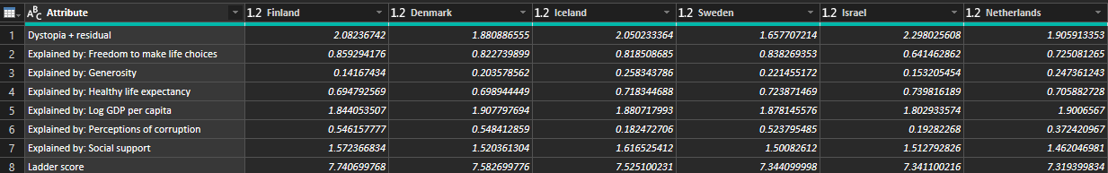 Here there are 8 total rows but a lot of columns. How it is defined is the attributes column will be my points on the chart where as my other columns are all countries and their respective values in those columns. A little bit of pivoting to achieve this and then were good to go!