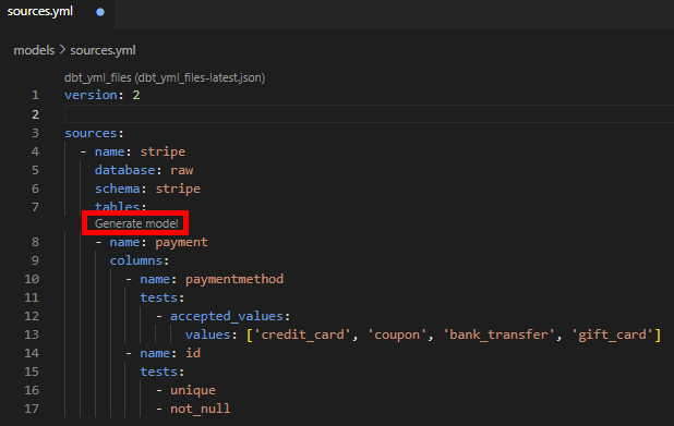 While defining your sources in a YAML file, you may have noticed some text that says 'Generate model'. Clicking on this will automatically create a staging model for you that you can then customize according to your needs: